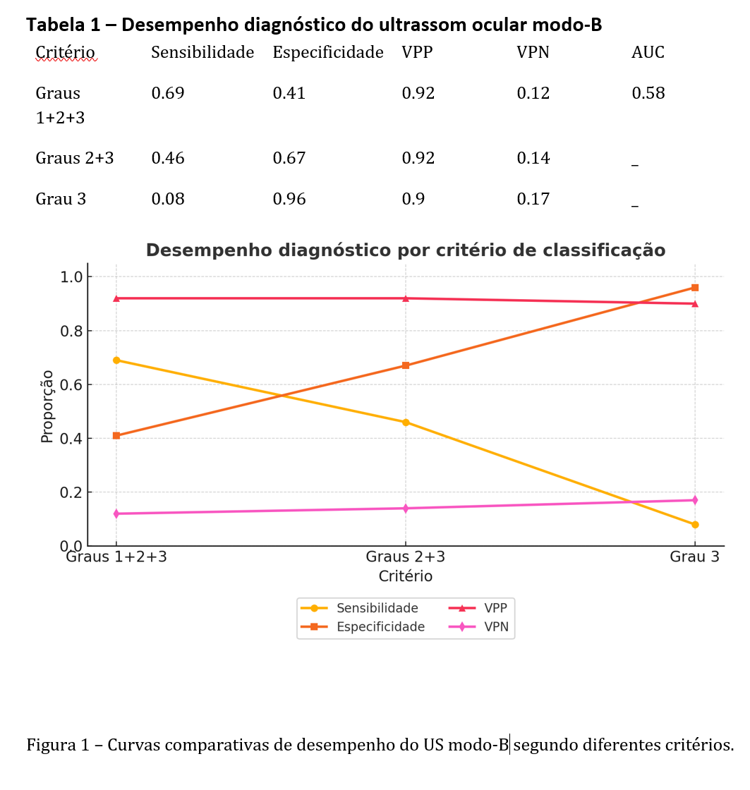 Apesar de promissor, o ultrassom ocular modo-B apresenta acurácia diagnóstica limitada. Seu uso deve ser considerado auxiliar, sendo necessários novos estudos com maior padronização metodológica.